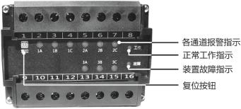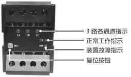 面板內(nèi)容 含義 1A、1B、1C 2A、2B、2C 3A、3B、3C 檢測各路運(yùn)行狀態(tài),當(dāng)任何一路保護(hù)時,故障燈點(diǎn)亮。 工作 裝置正常運(yùn)行時,每秒種閃爍一次 故障 裝置本身故障時點(diǎn)亮 復(fù)位 當(dāng)某路發(fā)生故障時,在排除故障后按此鍵裝置恢復(fù)正常